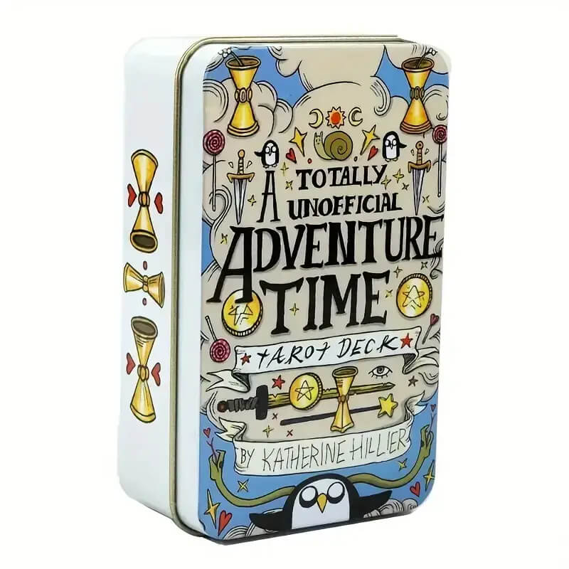 Adventure Time Tarot — яркая и необычная колода, вдохновлённая мультсериалом «Время приключений». Каждый аркан оформлен в авторском стиле с узнаваемыми персонажами и символикой, сохраняющей структуру классической системы Райдер–Уэйта. Колода подойдёт для творчества, гаданий и коллекционирования. Карты упакованы в металлический кейс с красочным дизайном, а их края украшены мерцающим синим блеском.