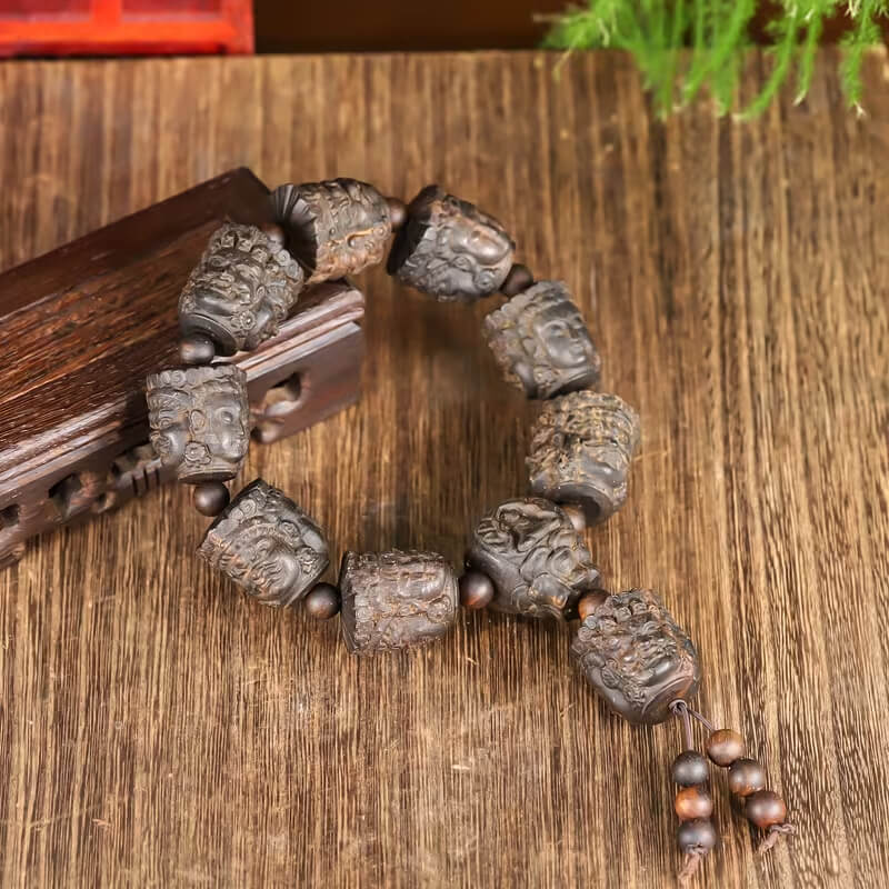 Уникальный браслет ручной работы, вырезанный из ароматного агарового дерева, украшен миниатюрными ликами буддийских божеств — Дхьяни. Каждая бусина несёт в себе символику просветления, сострадания и духовной защиты. Этот браслет создан в винтажном стиле с акцентом на традиционное тибетское искусство.