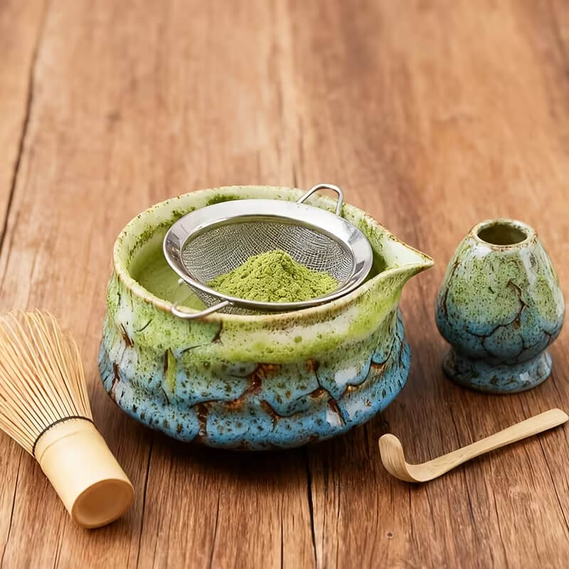 Набор для матча «Изумрудный поток» — это выразительное сочетание традиционных инструментов и эффектной керамики с природными оттенками. Глубокие зелёно-синие переливы создают ощущение движения воды и спокойствия, превращая приготовление матча в особый ритуал.