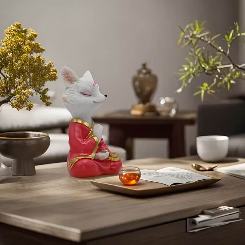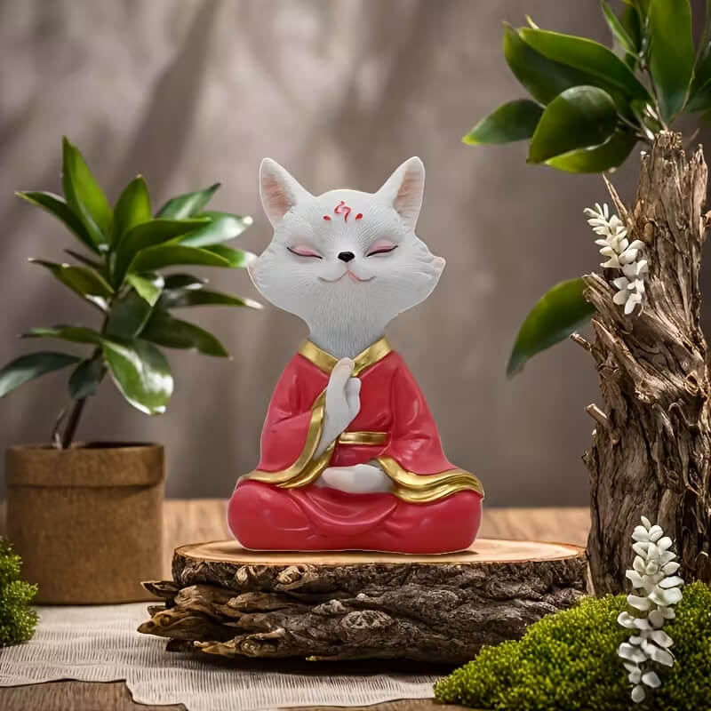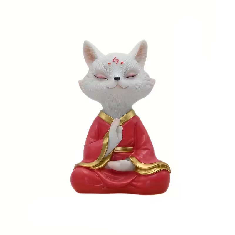 Чайная фигурка «Медитирующий белый лис» в красном халате, 12,8×8 см.