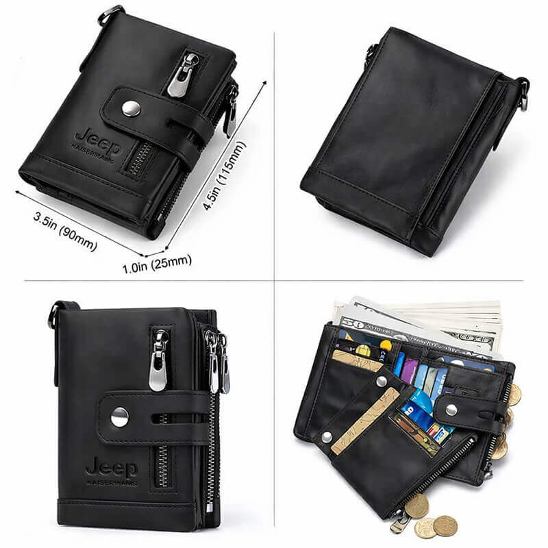 Модель оснащена несколькими отделениями на молнии, что обеспечивает удобную организацию содержимого. Внутри предусмотрены отделения для купюр, банковских карт, монет и мелких аксессуаров. Надёжные металлические молнии и кнопка фиксируют кошелек и защищают его содержимое.