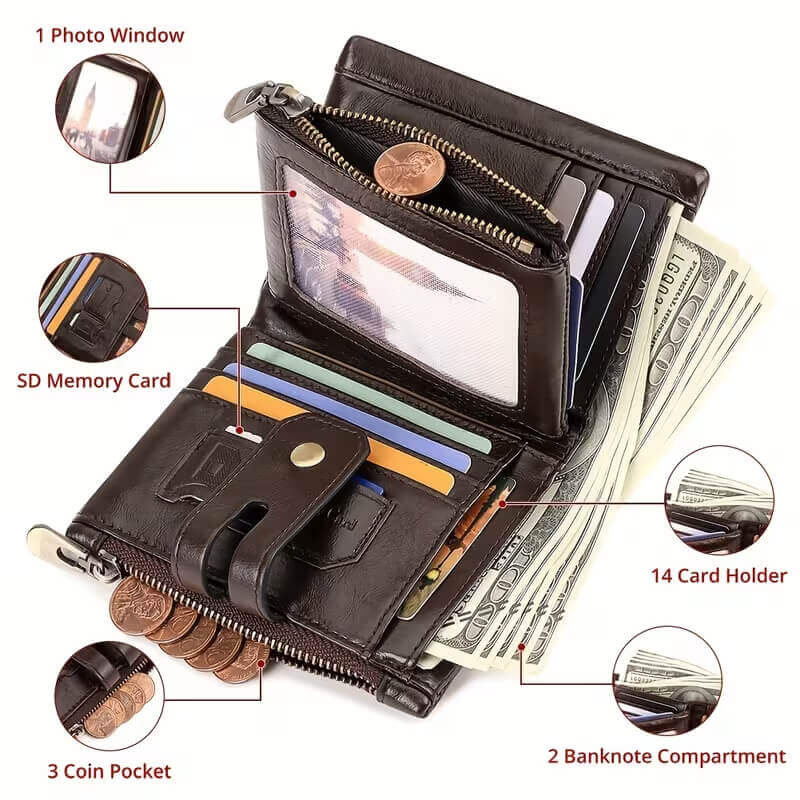 Мужской кожаный кошелек «Route 66» — это практичный и функциональный аксессуар для повседневного использования. Выполнен из натуральной коровьей кожи с характерной текстурой, которая подчёркивает стиль и долговечность изделия.