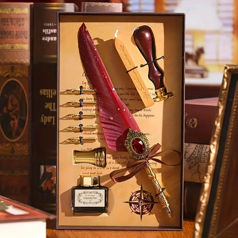 Винтажный набор для письма и каллиграфии с бордовым пером и рубиновым декором создан для тех, кто ценит красоту рукописного письма и эстетику старины. Комплект сочетает элегантность, практичность и вдохновение, добавляя процессу письма особое очарование.