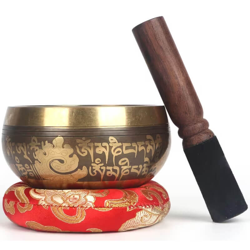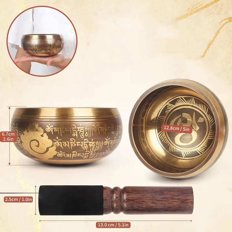 Чаша диаметром 12 см украшена сакральными символами и мантрами, которые усиливают её духовное значение. При извлечении звука с помощью деревянного стика с мягкой обмоткой создаётся чистая и продолжительная вибрация, наполняющая пространство спокойствием.