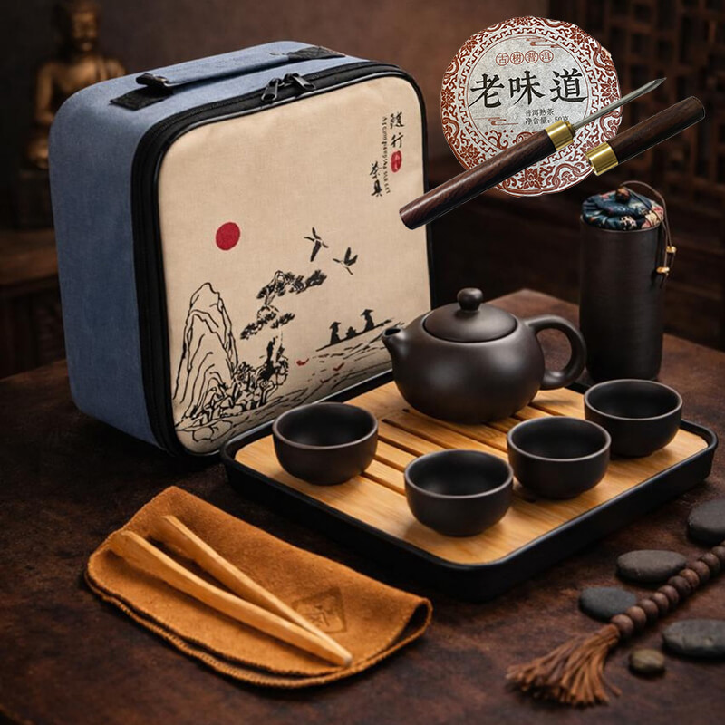 Классическая посуда из тёмной керамики подчёркивает глубину и насыщенность вкуса пуэра, а чабань создаёт удобное пространство для проливов. Компактный кейс позволяет удобно хранить и брать набор с собой, сохраняя порядок и целостность всех элементов.