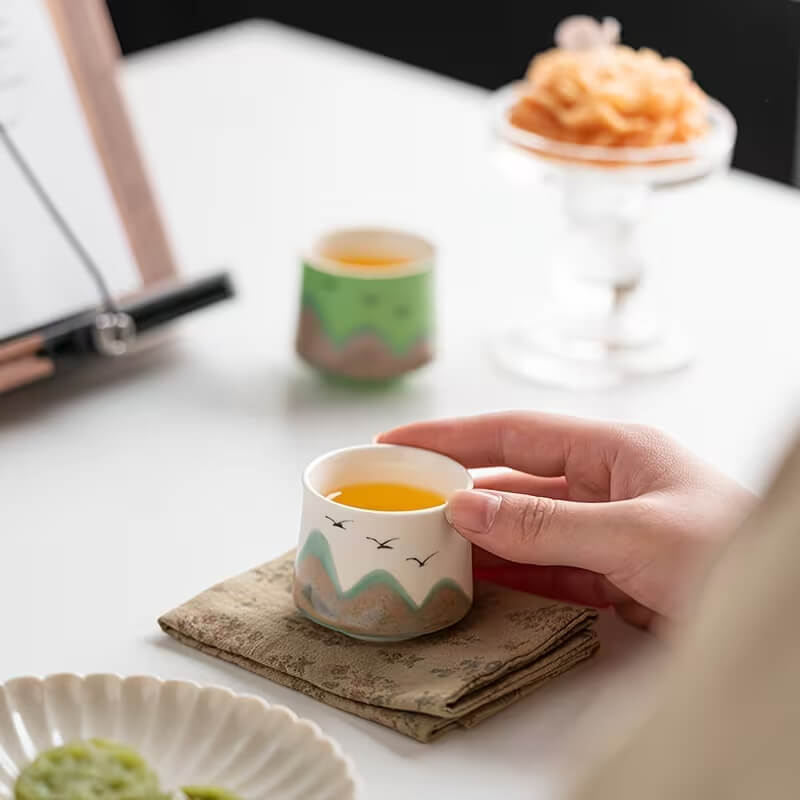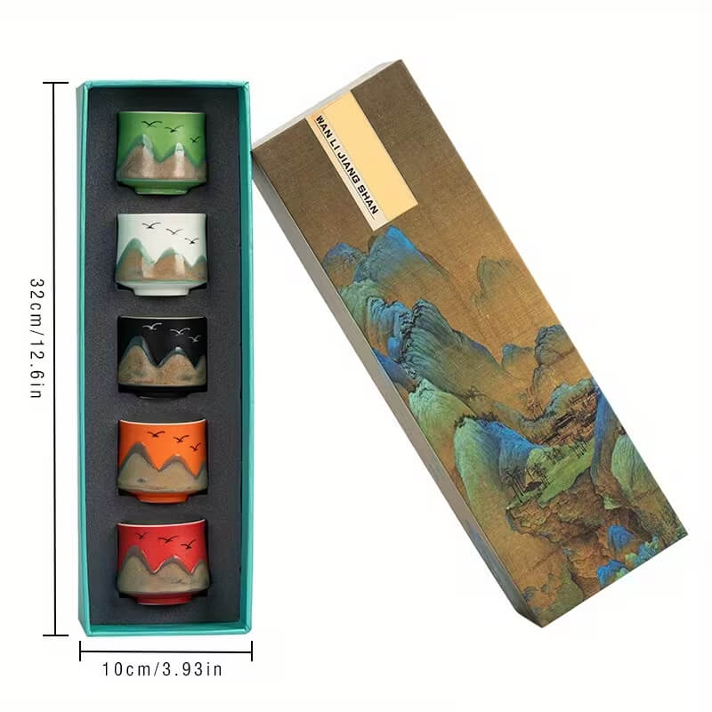 Набор пиал «Дыхание гор» — это стильный комплект из пяти чаш, выполненных в разных цветах и вдохновлённых природными пейзажами. Каждая пиала украшена силуэтами гор и птиц, создавая атмосферу спокойствия и гармонии во время чаепития.