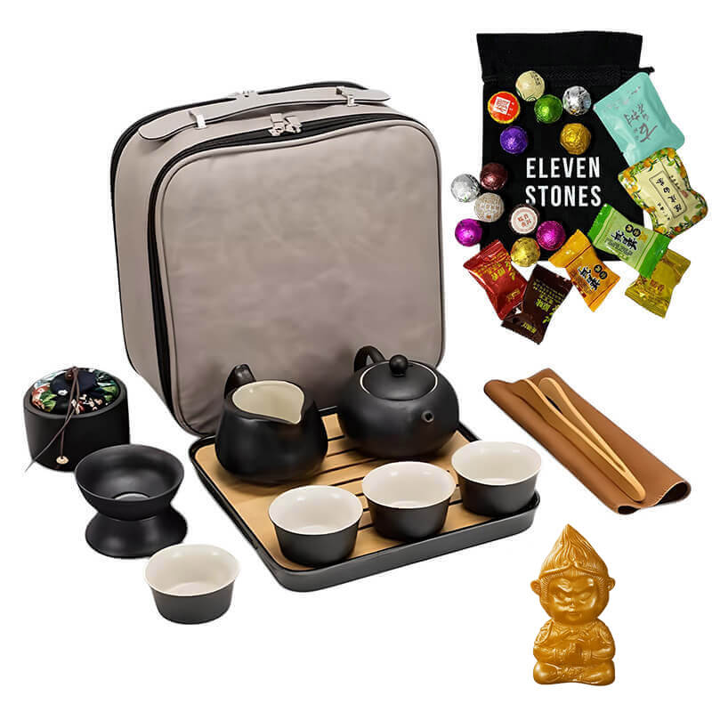 Набор для чайной церемонии «Исин» Eleven Stones в серой сумке с чаем пуэр 20 шт и чайной фигуркой Бога богатства.