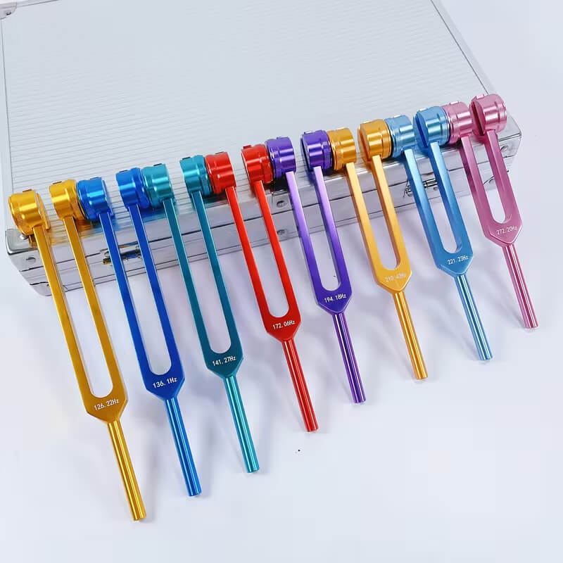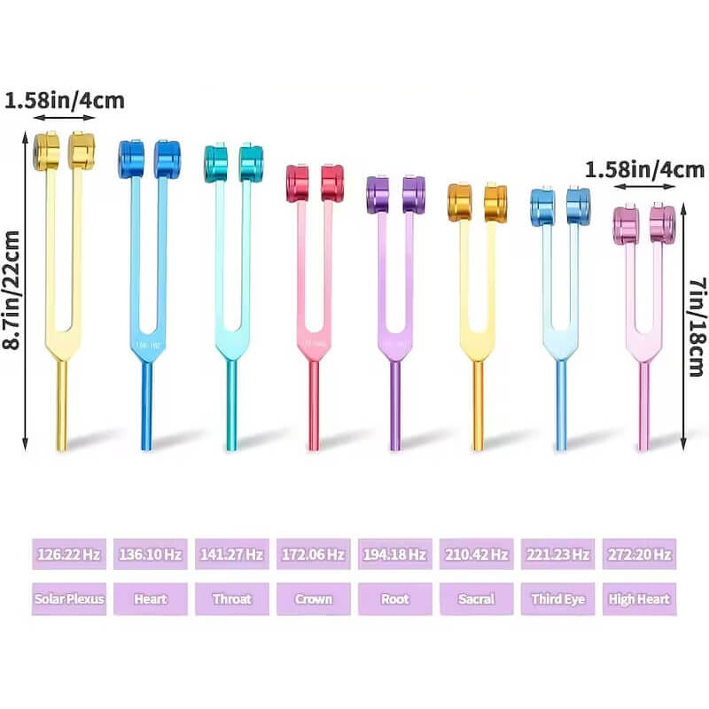 Набор из 8 камертонов из анодированного алюминия, настроенных на точные частоты для работы с чакрами и энергетическими центрами. Камертоны издают чистый и устойчивый звук, помогая расслабиться, восстановить энергию и гармонизировать тело и сознание.
