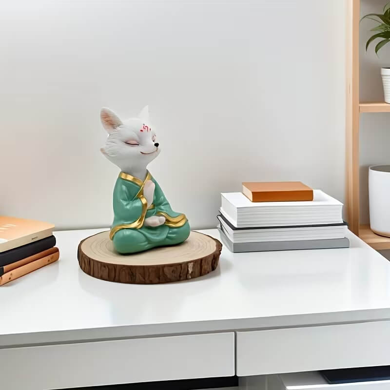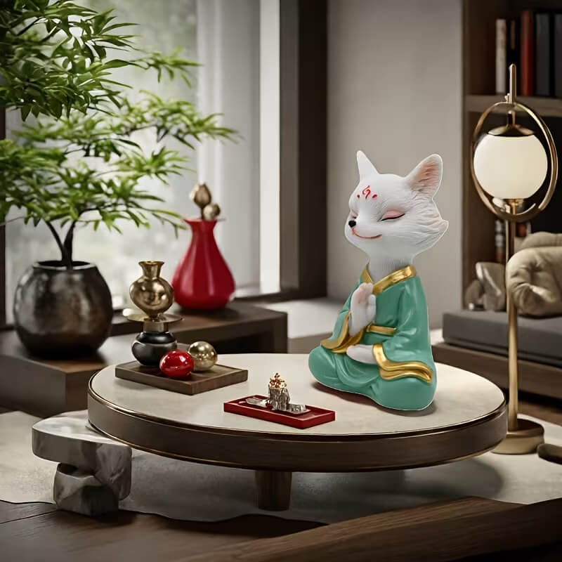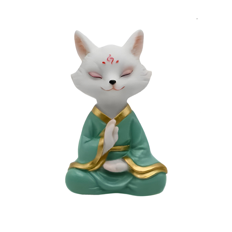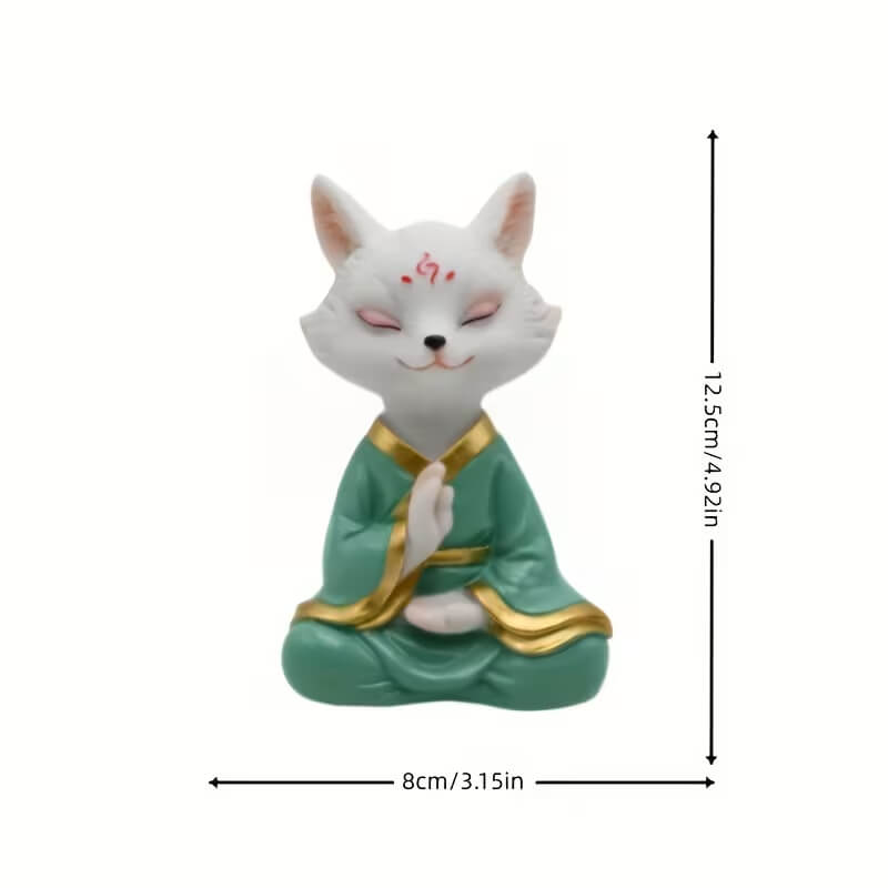 Чайна фігурка «Медитуючий білий лис» в зеленому халаті, 12,5×8 см.