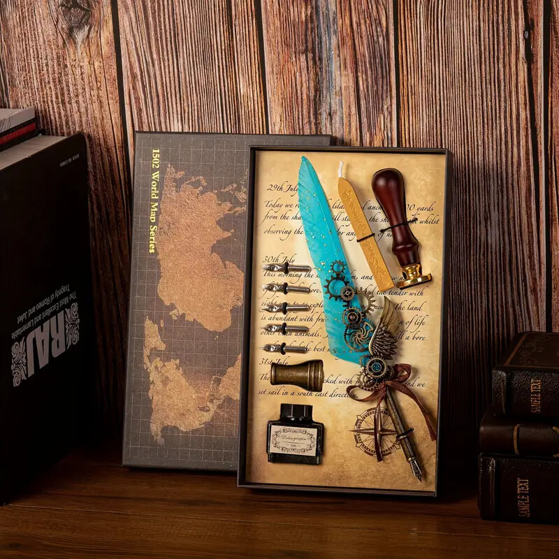 Вінтажний набір для письма та каліграфії з блакитним пером у стилі стимпанк — це вишукане поєднання класики й креативності. Металеві шестерні та насичений небесний відтінок пера надають набору унікальності, перетворюючи його не лише на інструмент для письма, а й на декоративний елемент із характером.